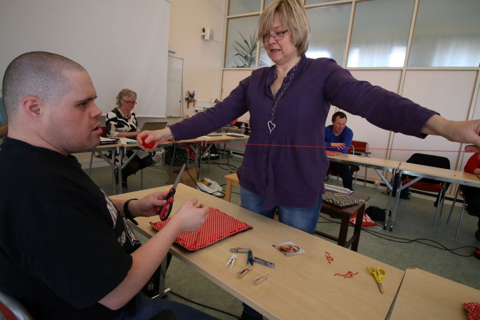 Vår Hälsopedagog visade några moment i taget och deltagarna gjorde efter. Att få se och direkt göra samma moment underlättade för deltagarna och de flesta klarade av att skapa sitt sittunderlag själv. Att trä på nålar och fästa trådar var sådana moment som skolstödpersonerna fick hjälpa några deltagare med.